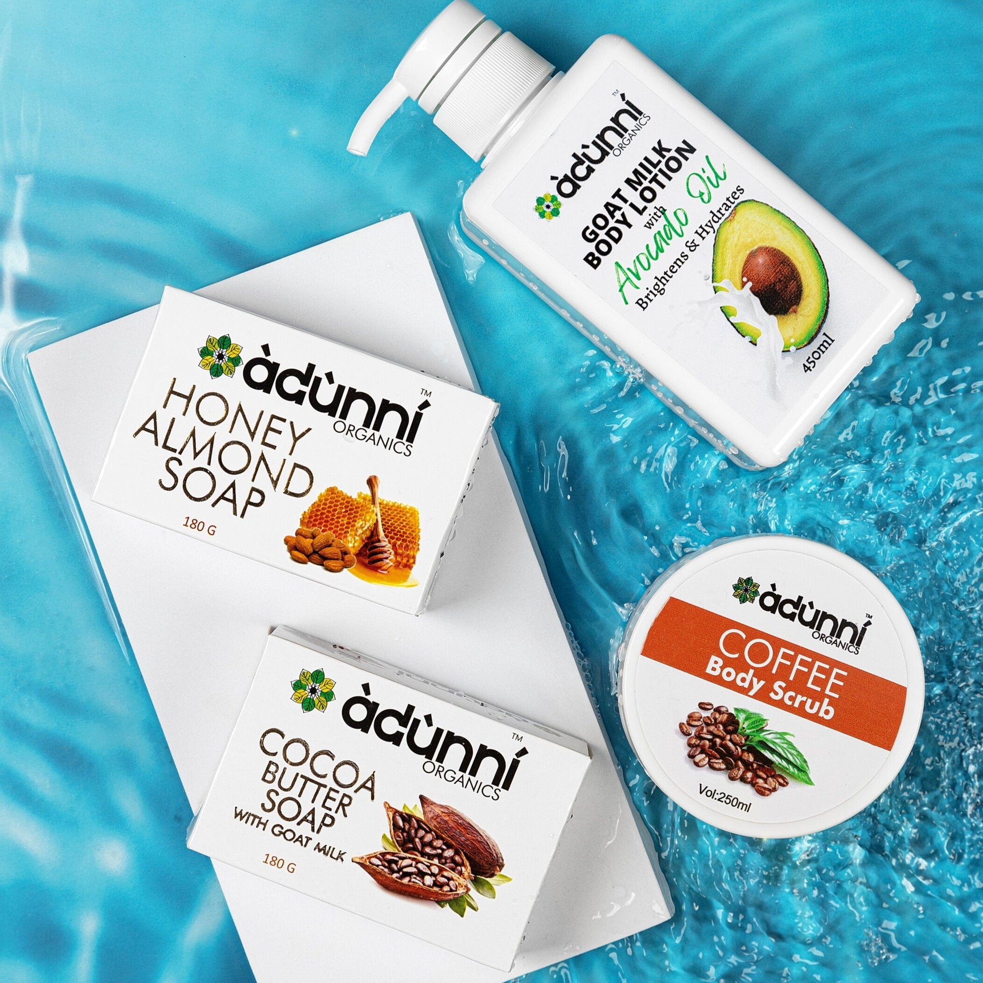 Body Glow Kit is a combination of Goat Milk Lotion, Honey Almond Soap, Cocoa Butter Soap, and Coffee Body Scrub. This kit will brighten the skin and polish it to a radiant SKIN GLOW.