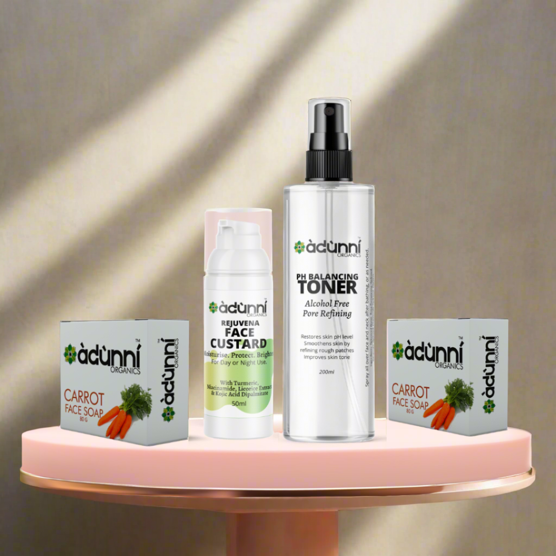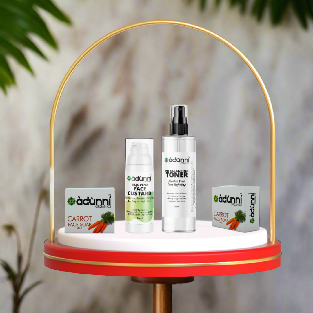 Consistent usage of the Adunni Organics Face Glow Kit brightens facial skin, clears blemishes, lightens uneven skin tone and makes facial skin glow up with visible results within 6 to 12 weeks of use.