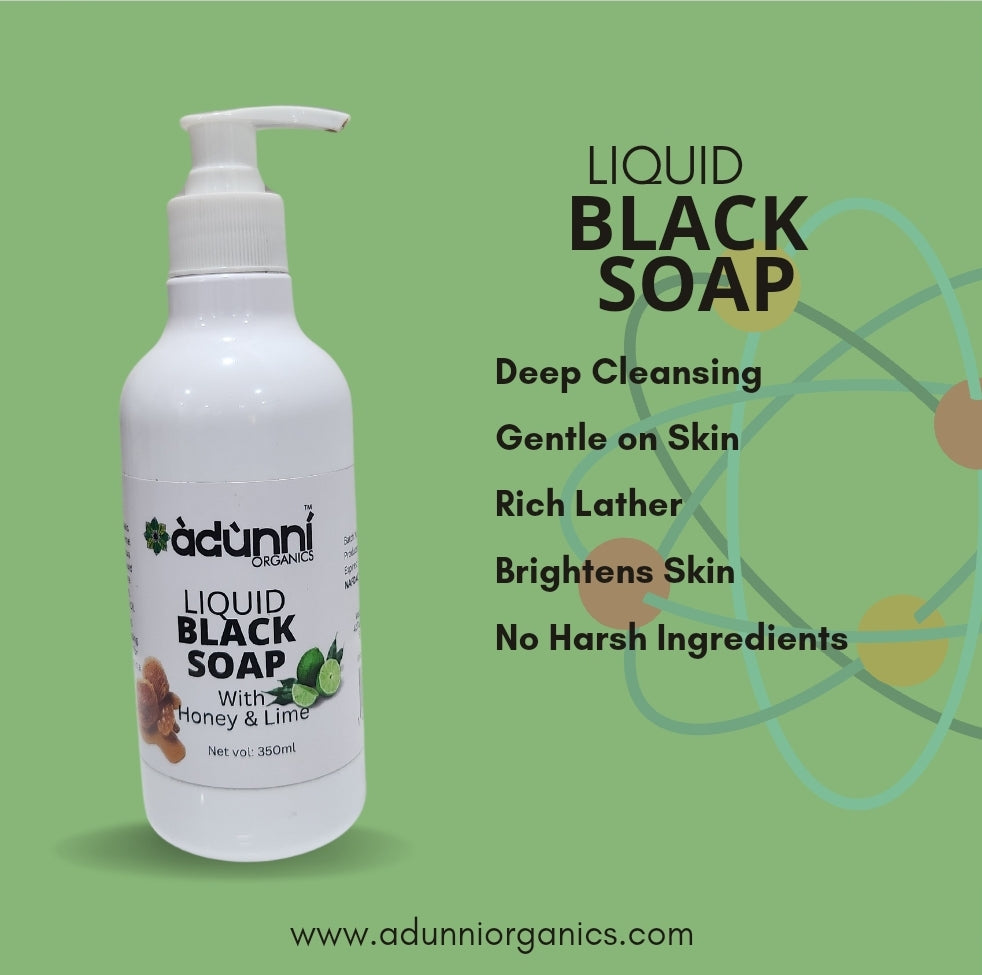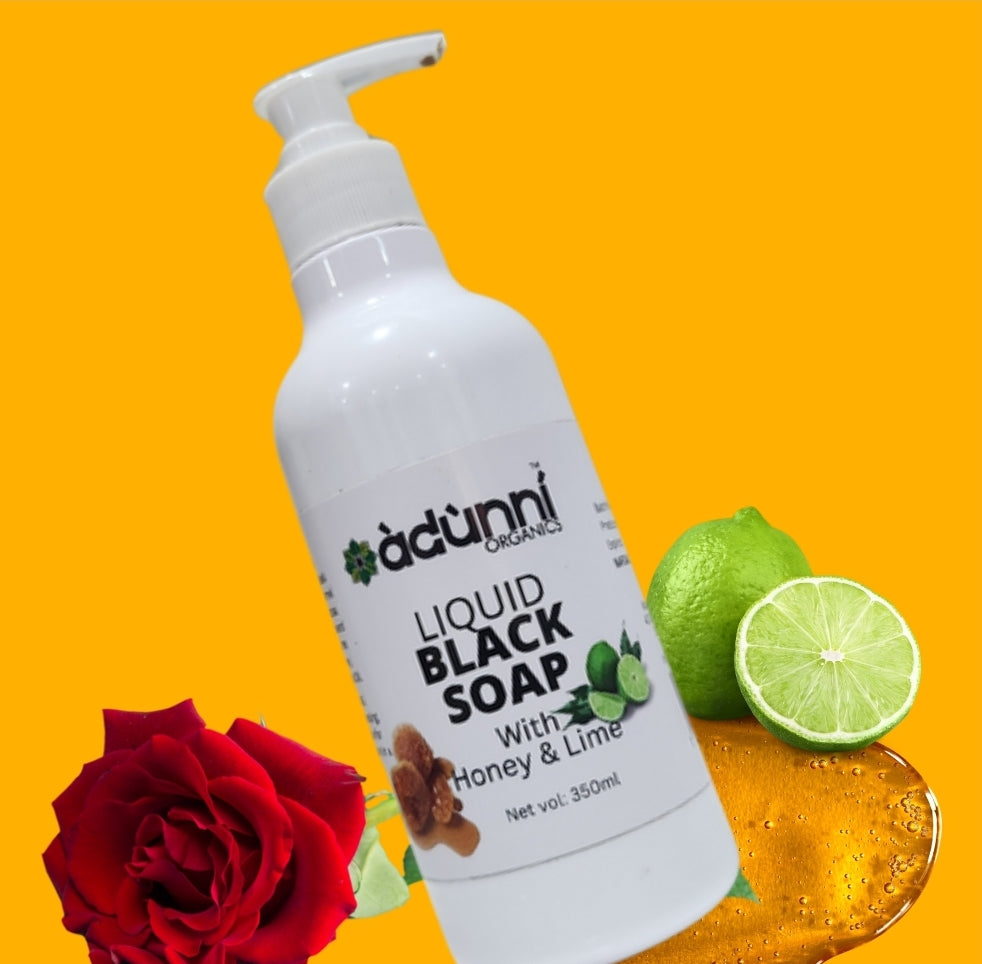 Liquid Black Soap from Adunni Organics is rich in Vitamin E which is a skin healer and Vitamin A, a good source of Collagen, It is further enriched with Honey, Rosewater, Lemongrass and Lime to give your skin the awesome goodness that it needs to glow. Our Liquid Black Soap which cleans and exfoliates gently without stripping the skin of its natural oils, is also a great shampoo to use as part of a healthy hair care routine.