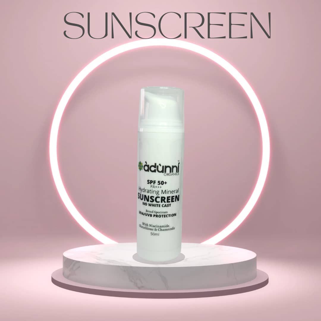 Adunni Organics mineral + chemical sunscreen gives you broad-spectrum SPF 50 PA+++ protection against harsh UV rays while helping to even skin tone, prevent dark spots, and calm sensitivity. It blends powerful sun filters like Nano Zinc Oxide and Octocrylene with skin-loving ingredients like Glutathione, Niacinamide, Centella Asiatica, and soothing Chamomile.